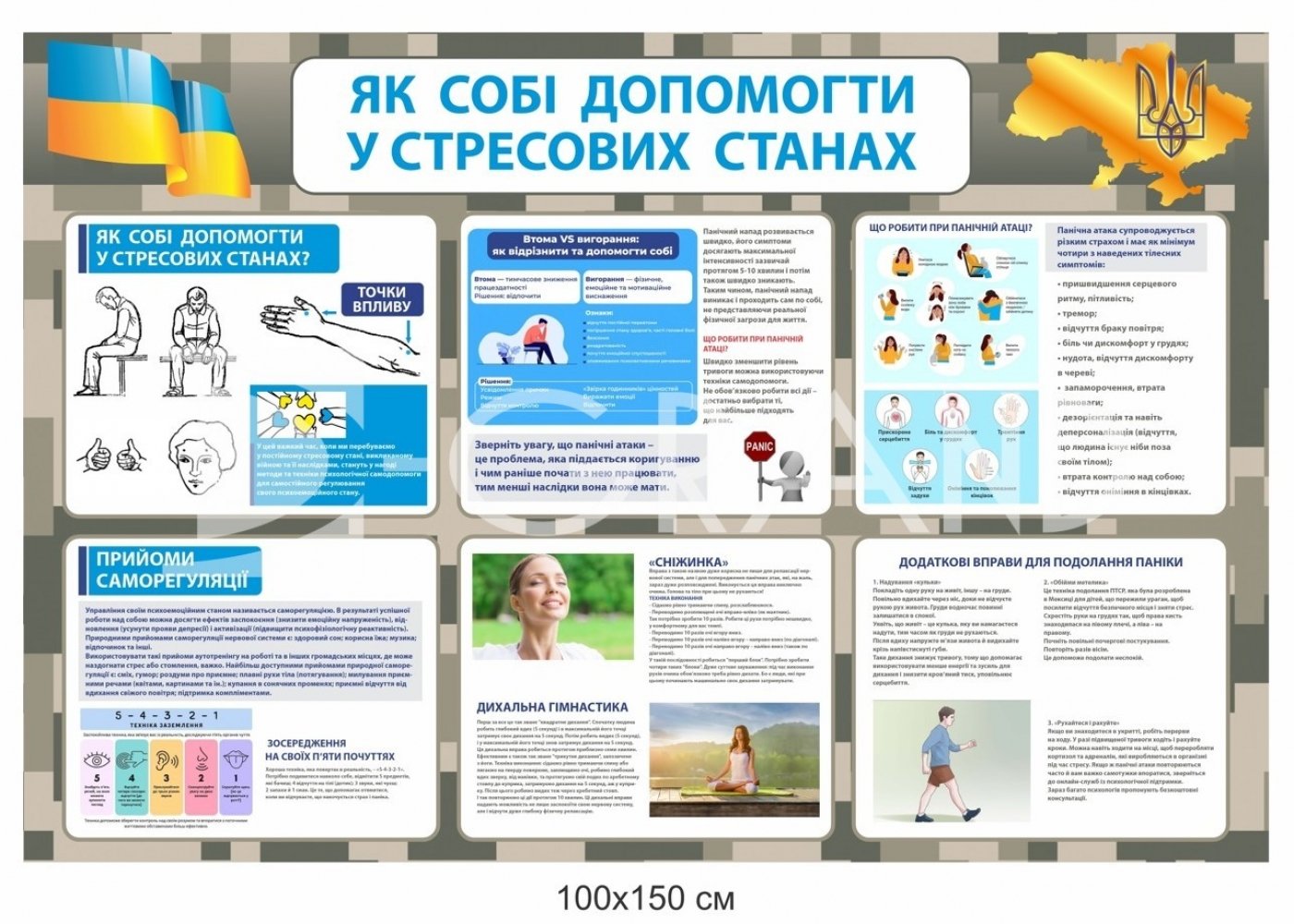 Банер розміром 100×150 см поєднує ілюстрації, вправи й короткі поради з самодопомоги. Зокрема, він включає: