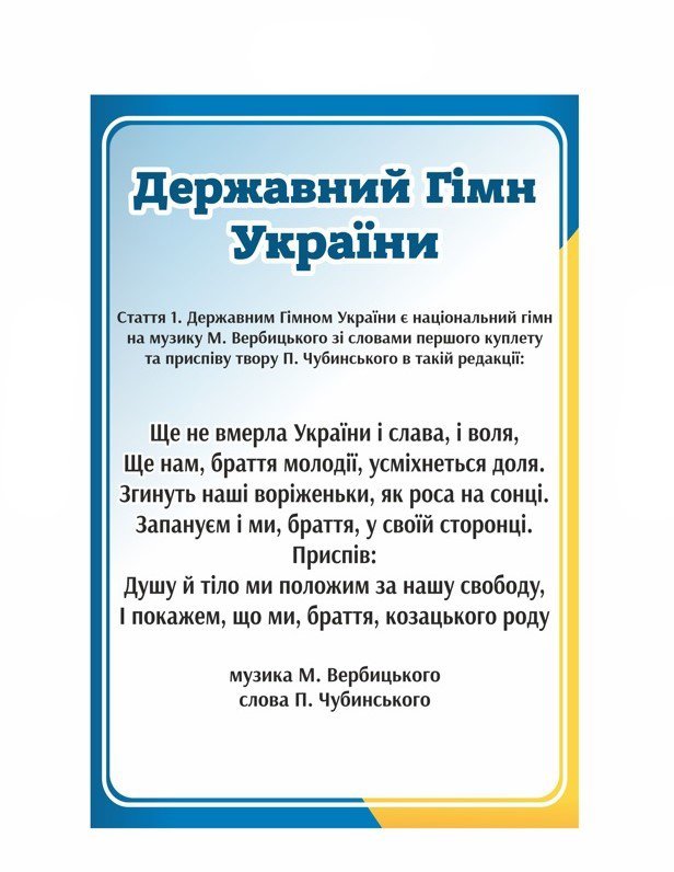 Державні символи України — це основа нашої національної ідентичності. Вони мають не лише історичне, а й виховне значення. Саме тому важливо, щоб вони були присутні в освітньому середовищі, на стендах, у громадських просторах і в кожному місці, де формується українська свідомість.