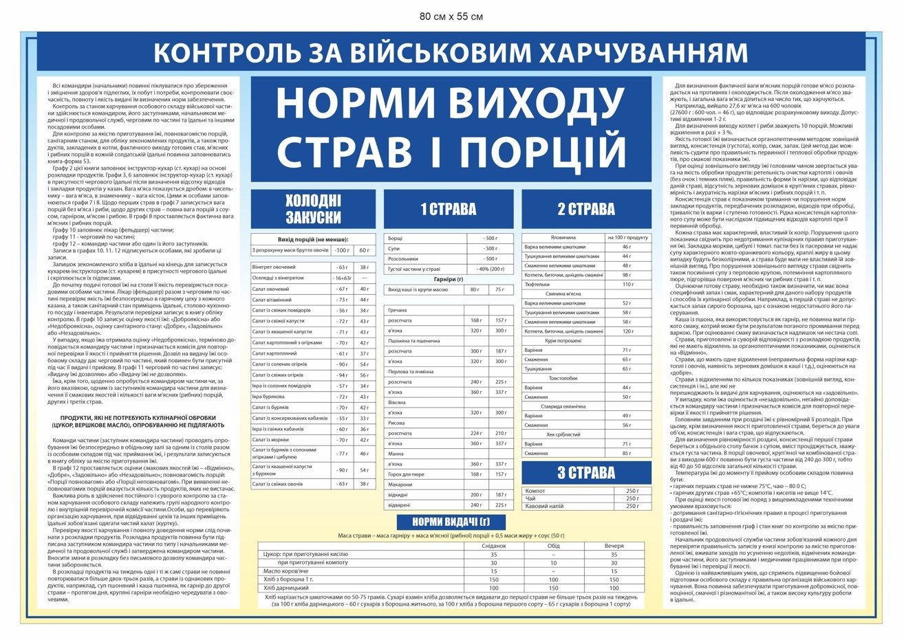 Наприклад, стенд вказує, що вихід порції борщу має становити 500 г, а компоту – 250 г. Завдяки такій деталізації командири та кухарі можуть уникати помилок у видачі страв і контролювати дотримання стандартів.