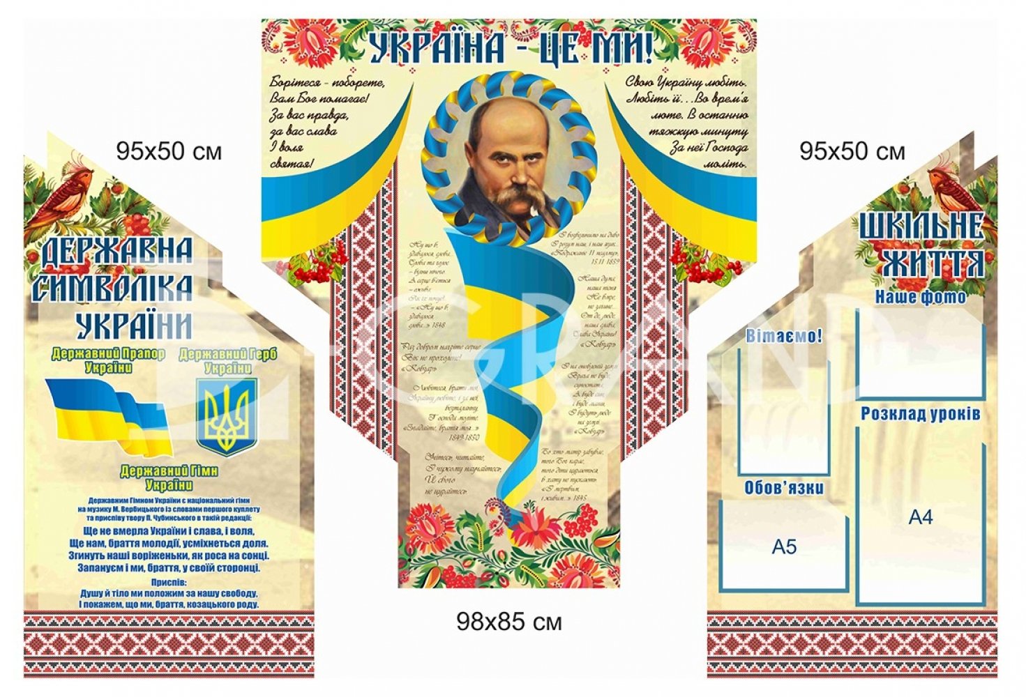 Для закладів освіти замовляють стенди, які містять зображення Герба, Прапора та тексту Гімну України, а також витяги з Конституції або інформацію про історію символів.