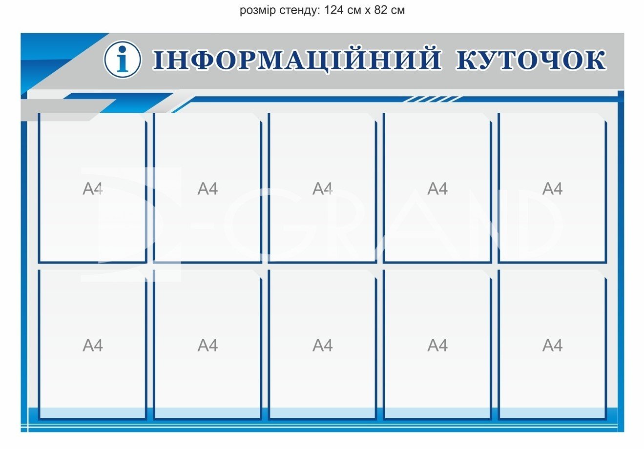 Стенд виконаний у державних кольорах України, що підкреслює офіційний статус установи та відповідає вимогам ділового оформлення. 10 прозорих кишень формату А4 дозволяють зручно розмістити накази керівництва, правила внутрішнього розпорядку, інформацію з охорони праці, пожежної безпеки, оголошення, графіки роботи та інші нормативні матеріали.