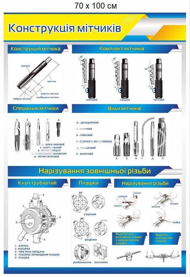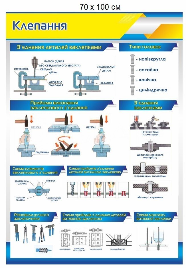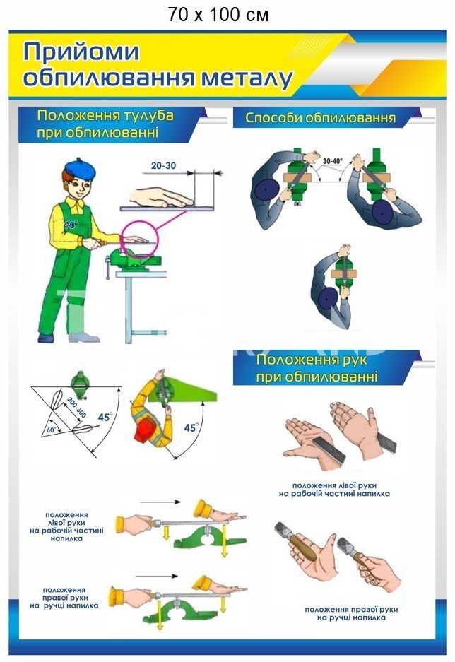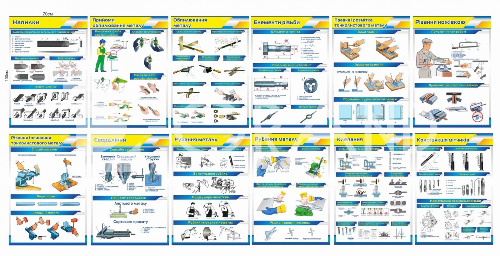 У комплект входять плакати з темами: напилки, обпилювання металу, свердління, рубання, клепання, різьба та інші операції. Ілюстрації виконані у зрозумілій формі, що робить навчальний процес більш ефективним і цікавим.