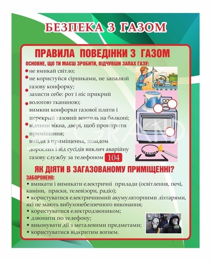 Дії при запаху газу: не вмикати світло, відкрити вікна для провітрювання, перекрити газовий вентиль та викликати аварійну службу за номером 104.