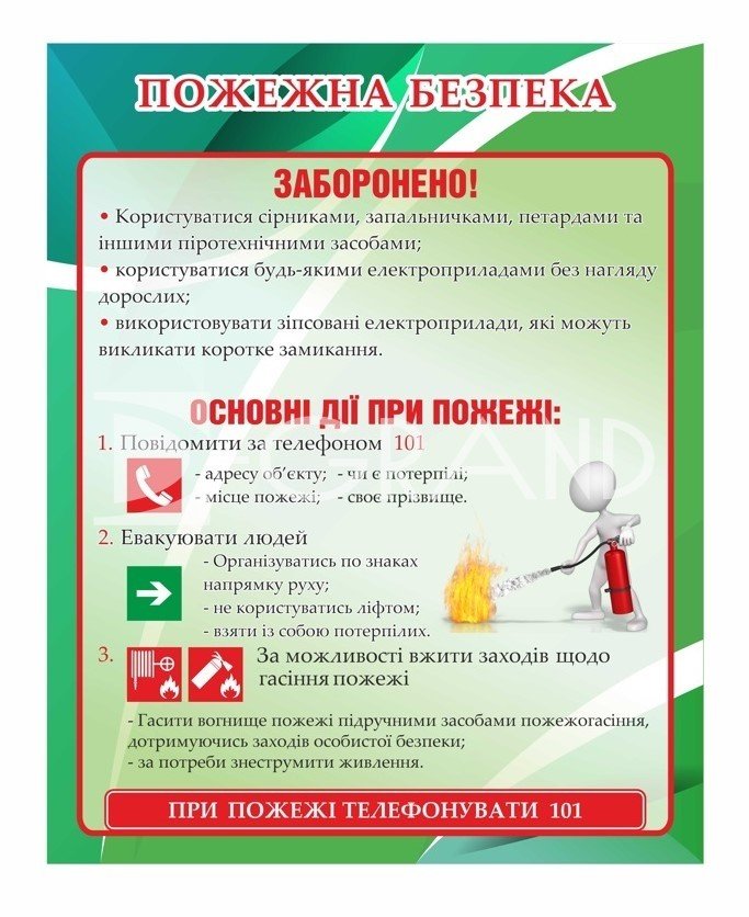 Алгоритм дій: повідомити за номером 101, евакуюватися за знаками напрямку руху (не користуватися ліфтом), за можливості вжити заходів щодо гасіння пожежі підручними засобами.