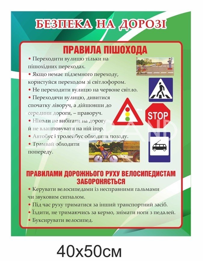 Правила пішохода: переходити вулицю лише на переходах, користуватися світлофором, перед переходом дивитися спочатку ліворуч, а потім праворуч.