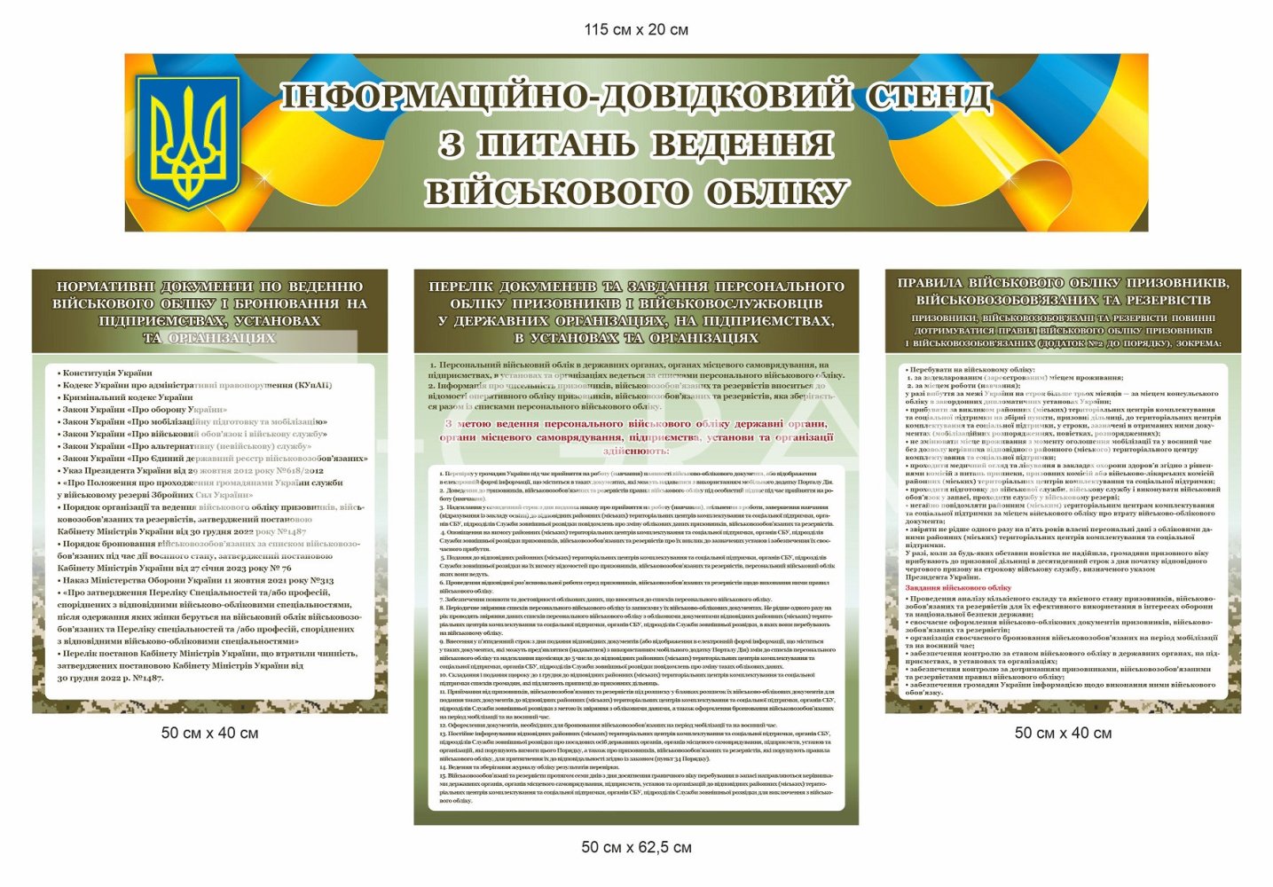 Комплект стендів "Інформаційно довідниковий стенд з питань військового обліку" кольору хакі