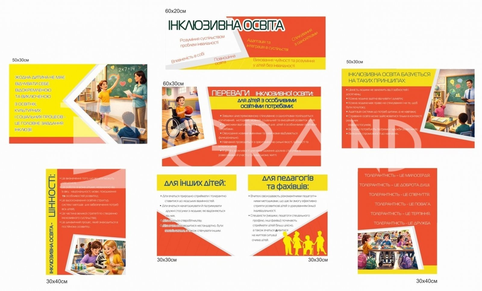 Цей набір стендів розроблений для популяризації ідей рівності, підтримки та розуміння в освітньому середовищі. Він допомагає сформувати у суспільстві правильне ставлення до проблем інвалідності та сприяє успішній інтеграції дітей з особливими освітніми потребами.