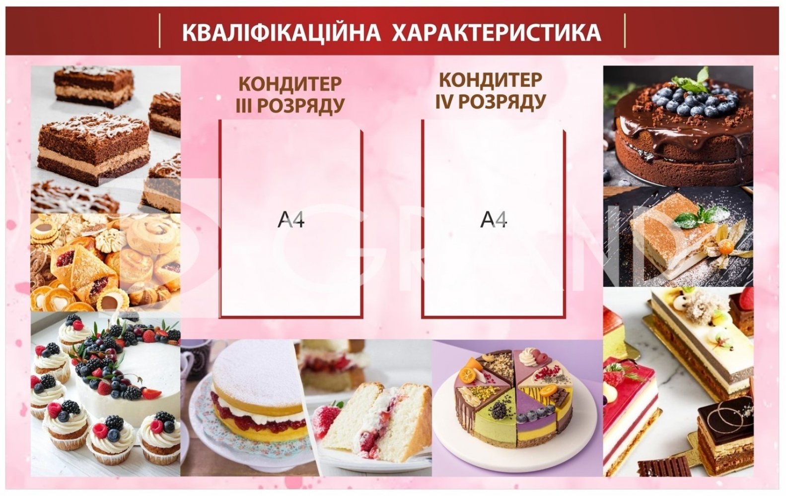 Представляємо спеціалізований стенд "Кваліфікаційна характеристика кондитера ІІІ та ІV розряду" – незамінний інформаційний ресурс для професійних навчальних закладів, виробничих підприємств, а також для самих кондитерів, які прагнуть до підвищення свого професійного рівня.
