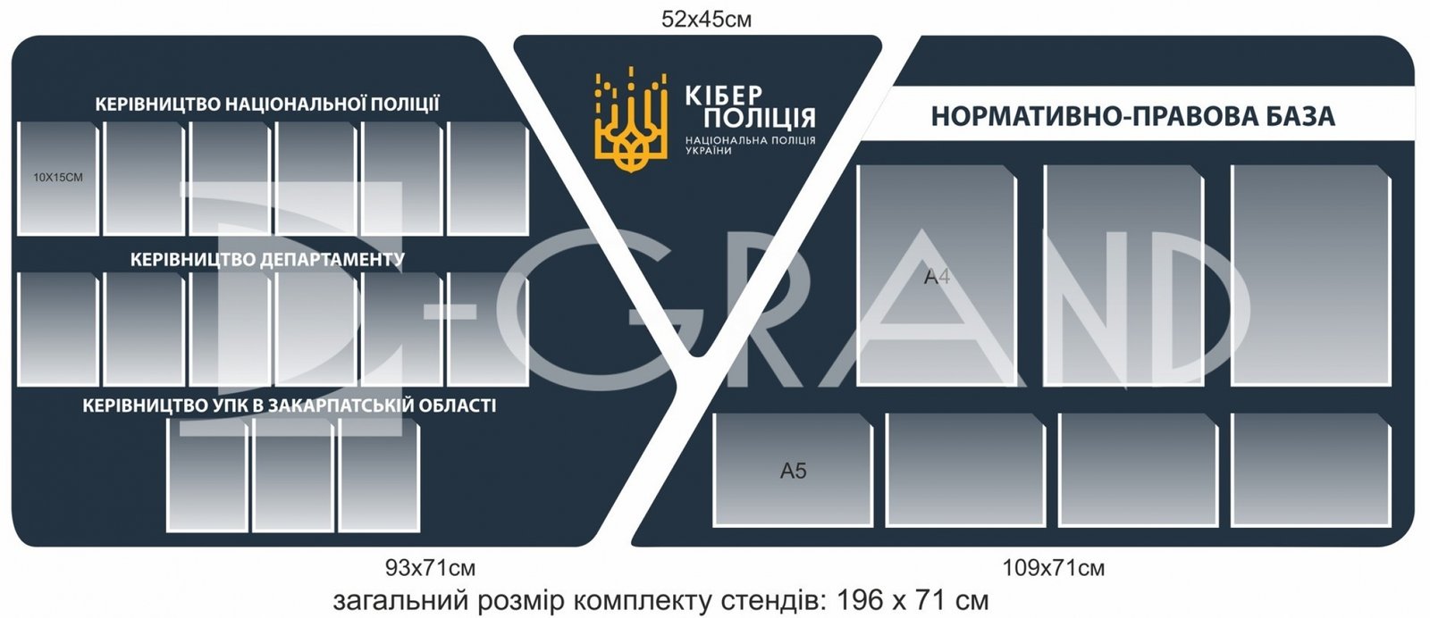 Набір інформаційних стендів для Кіберполіції України призначений для оформлення службових приміщень підрозділів Національної поліції та забезпечення зручного доступу до офіційної, довідкової й нормативно-правової інформації.