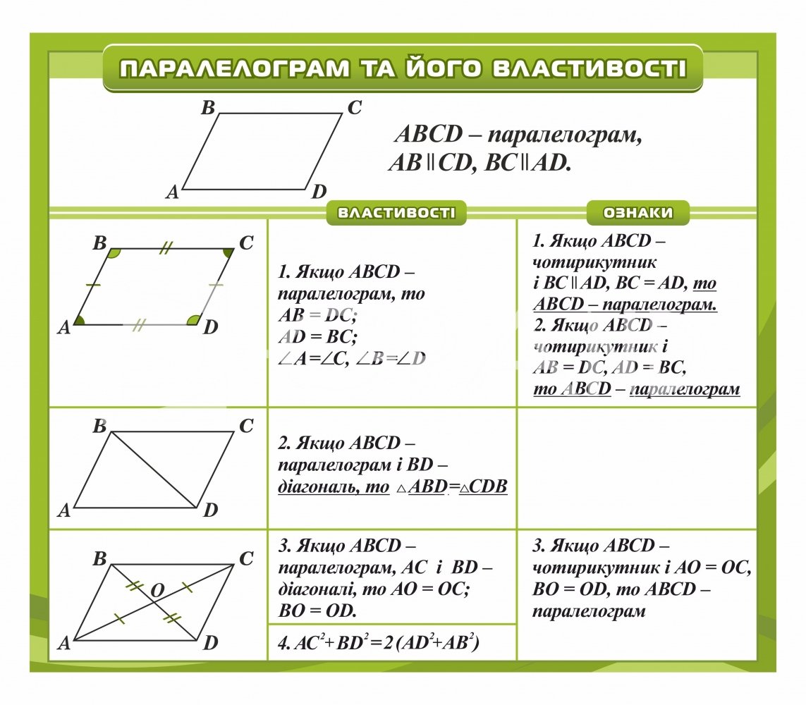 Стенд "Паралелограм. Властивості та ознаки" розроблений спеціально для кабінетів математики у школах та навчальних закладах. Він містить важливу інформацію, формули з геометрії, які допоможуть учням підготуватися до важливих іспитів, таких як ЗНО (Зовнішнє незалежне оцінювання) та ДПА (Державна підсумкова атестація).