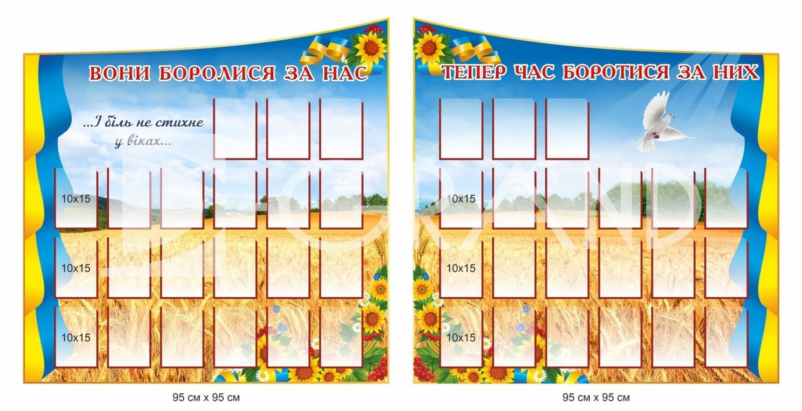 Сучасний емоційний комплект патріотичних стендів «Вони боролися за нас… / Тепер час боротися за них» створений для гідного вшанування героїв та формування національної свідомості. Дизайн виконаний у синьо-жовтій гамі з символами України — колоссям, небом, квітами та білим голубом миру, що підсилює глибокий зміст і викликає сильний емоційний відгук.