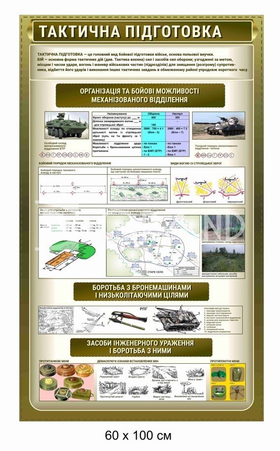 Цей плакат є комплексним посібником з головного виду бойової підготовки військ — тактичної підготовки, що є основою польової виучки. Він детально розкриває поняття бою як основної форми тактичних дій та надає візуальні інструкції для ефективного виконання бойових завдань.