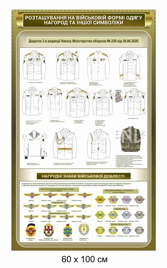 Плакат допомагає швидко зорієнтуватися у правильному розташуванні відзнак на формі та є важливим елементом підготовки військовослужбовців і курсантів.