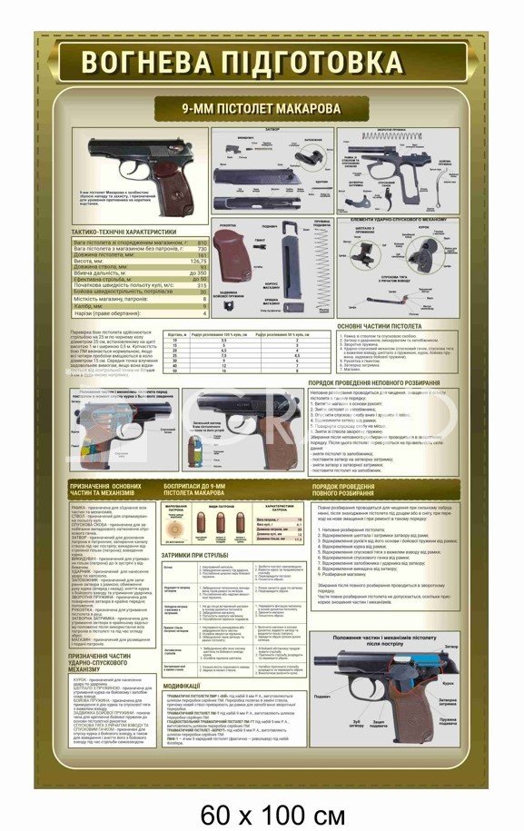 Плакат «Пістолет Макарова» — це наочний навчальний матеріал, який демонструє будову, принцип роботи та основні характеристики одного з найпоширеніших пістолетів у системі військової підготовки.