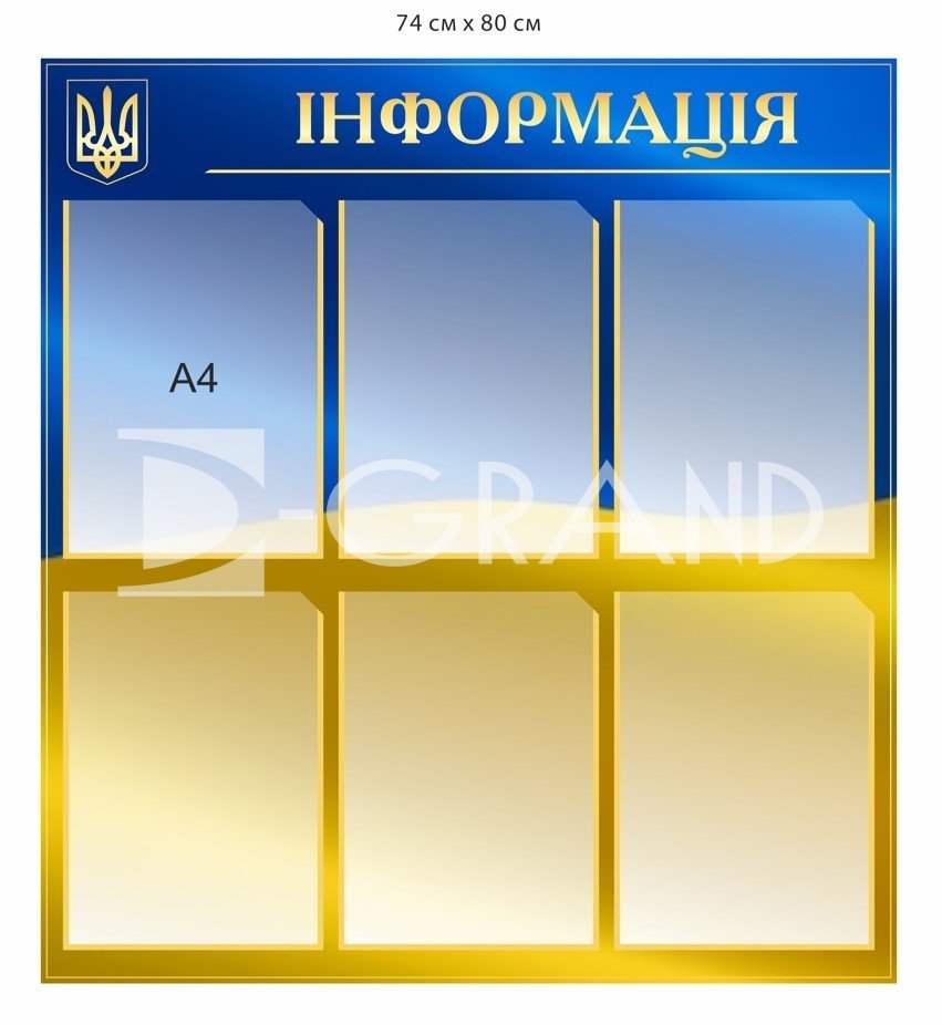 Стенд “Інформація” — це практичне рішення для розміщення важливої інформації у навчальних закладах, державних установах, офісах і на підприємствах. Завдяки помітному дизайну у національних кольорах стенд привертає увагу та забезпечує зручне ознайомлення з оголошеннями, наказами, графіками та довідковими матеріалами.