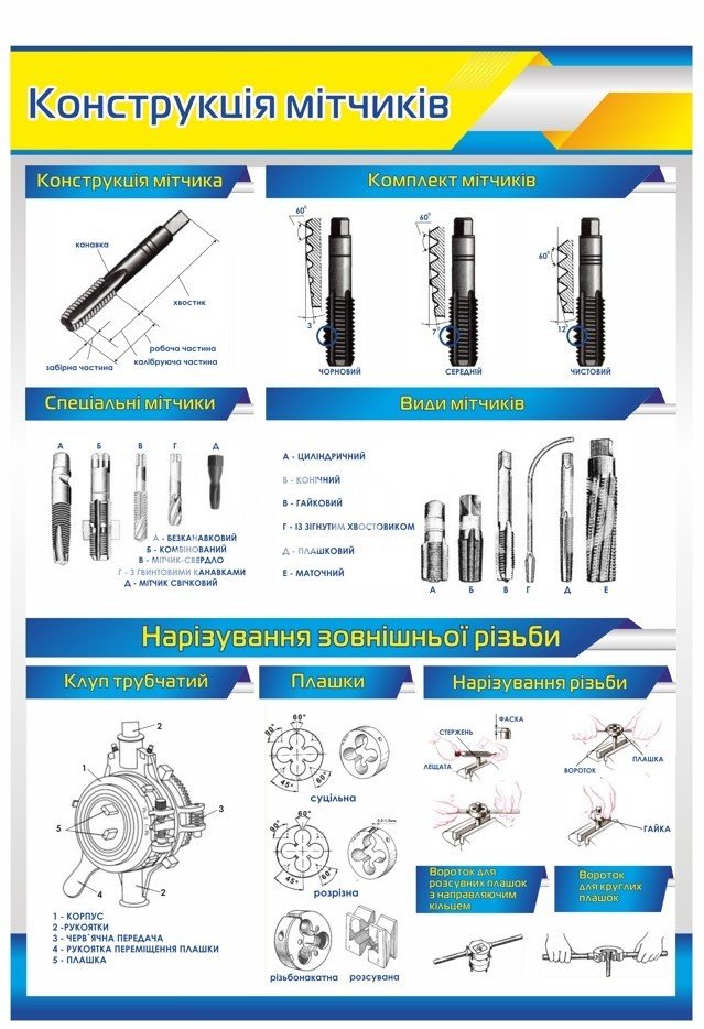 Стенд "Конструкція мітчиків" – це навчальний посібник для уроків трудового та виробничого навчання, який допомагає учням ознайомитися з будовою й призначенням мітчиків.