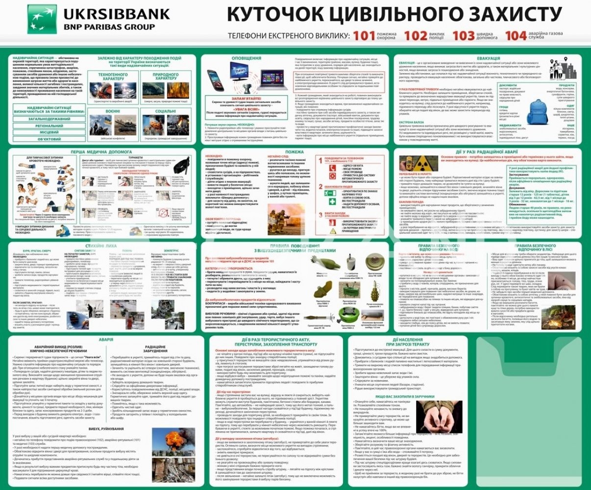 Забезпечення безпеки персоналу та клієнтів є критично важливим аспектом роботи сучасної банківської установи. Даний стенд розроблений як комплексний посібник, що містить чіткі інструкції та алгоритми дій у разі виникнення надзвичайних ситуацій (НС). Дизайн виконаний у відповідності до корпоративних стандартів (зелено-біла гама), що дозволяє йому органічно вписатися в інтер'єр офісного чи операційного залу.