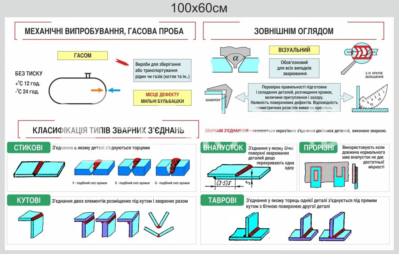 Стенд "Механічні випробування, гасова проба" – це наочний навчальний матеріал, що демонструє основні методи контролю якості зварних з’єднань. На стенді представлені схеми механічних випробувань і процес гасової проби, що дозволяє учням краще зрозуміти теоретичні знання та підготуватися до практичних занять.