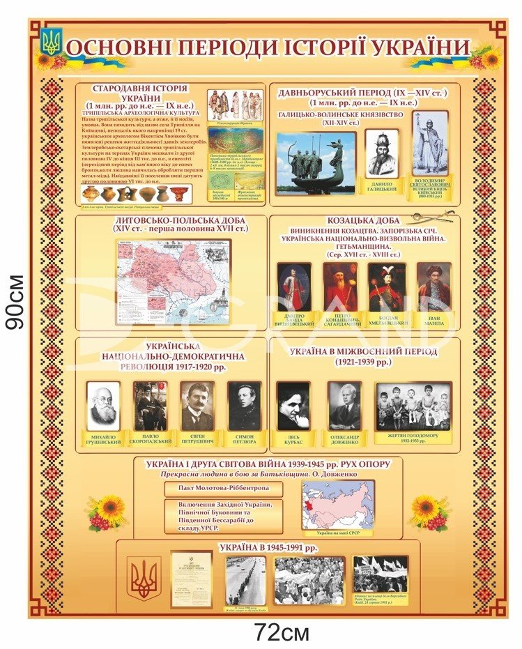 Стенд «Основні періоди історії України» — це наочний посібник, створений для шкільних кабінетів історії, класів НУШ та освітніх центрів. Він допомагає учням краще орієнтуватися у хронології подій, систематизувати знання та усвідомити безперервність розвитку української державності від давніх часів до сучасності.