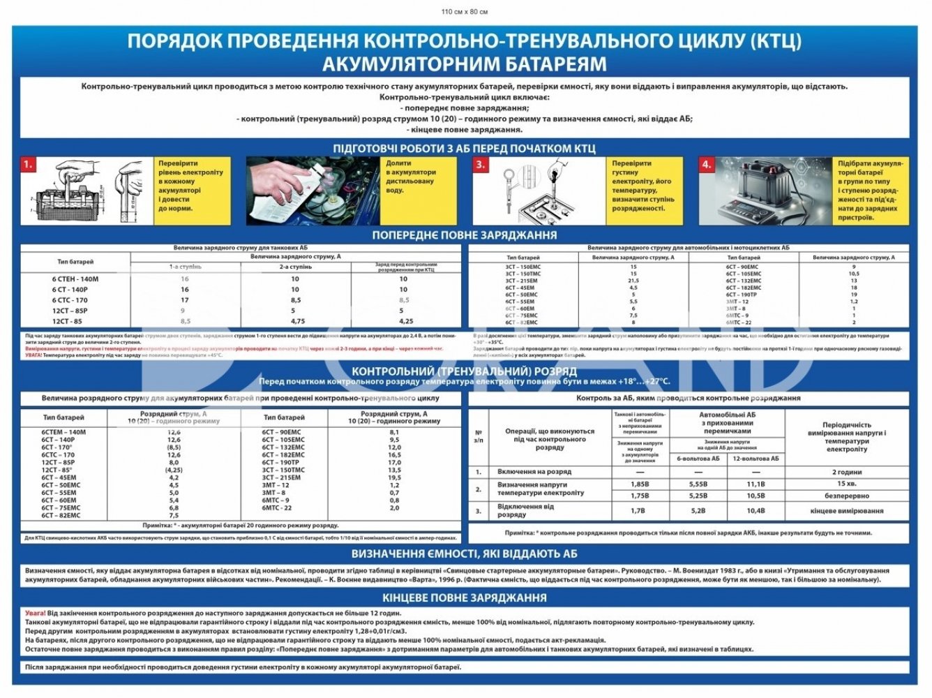 Стенд «Порядок проведення КТЦ акумуляторних батарей» призначений для наочного інформування персоналу про порядок виконання контрольно-тренувального циклу (КТЦ) акумуляторних батарей відповідно до вимог експлуатації, технічної безпеки та виробничих інструкцій.
