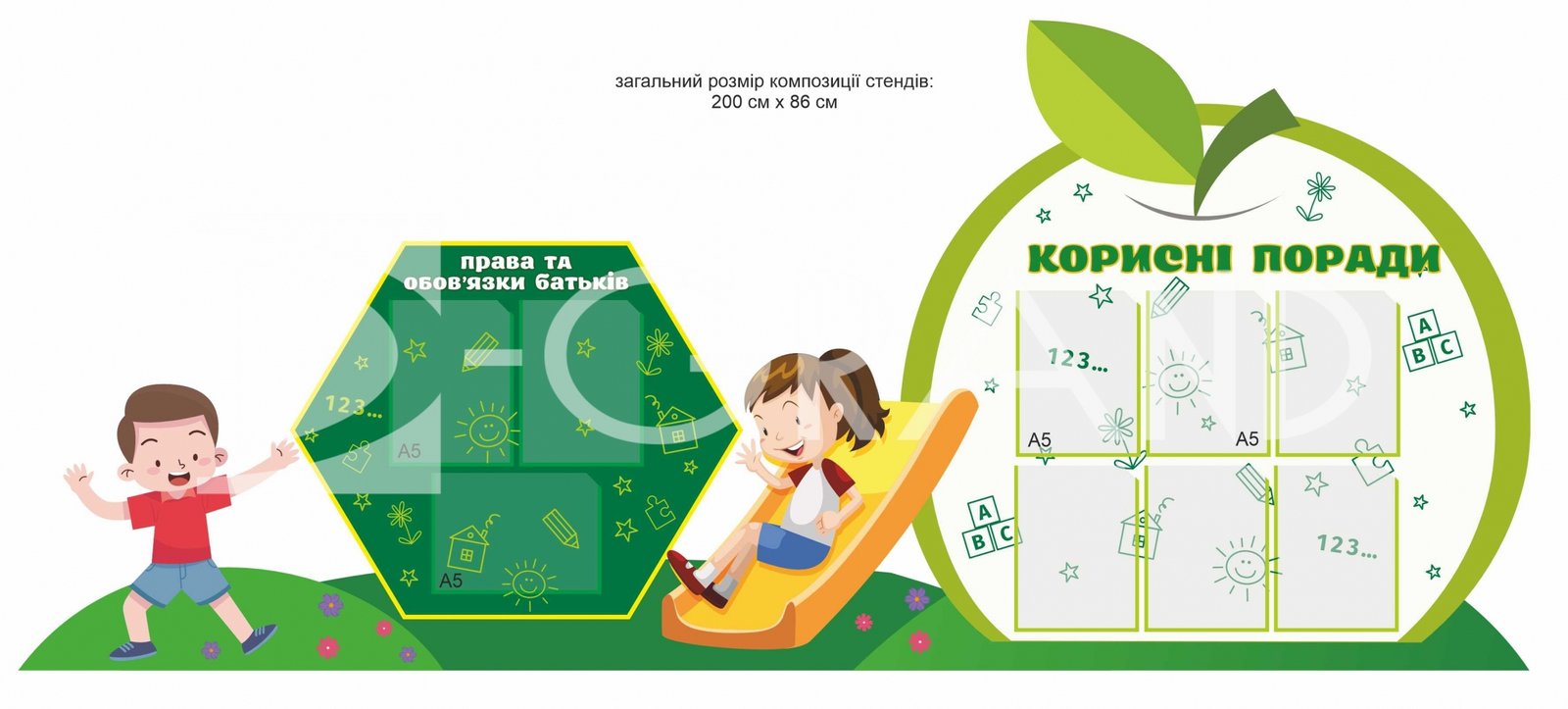 - Яскраві персонажі (хлопчик і дівчинка), які весело граються на гірці, створюють теплу, позитивну атмосферу та роблять стенд привабливим для батьків і дітей.