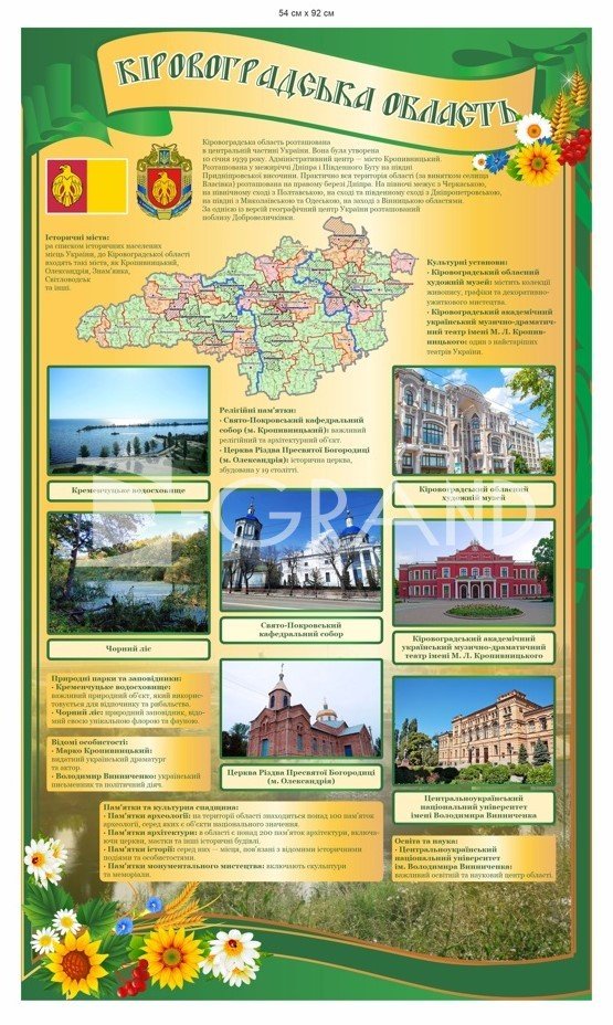 Навчальний стенд "Кіровоградська область" — це візуально привабливий і змістовний інфографічний матеріал, який знайомить учнів та відвідувачів з одним із центральних регіонів України. Він стане чудовим доповненням до шкільного кабінету географії, бібліотеки, туристичного куточка або культурного центру.