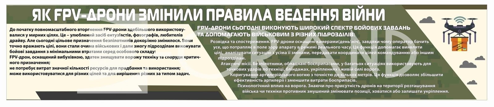 Сучасні інформаційні стенди, присвячені FPV-дронам, створені спеціально для навчальних аудиторій, тренувальних центрів та закладів освіти технічного й військового напрямку. Дизайн виконаний у стриманій мілітарі-стилістиці з акцентом на інформативність та наочність, що ідеально підходить для вивчення будови, принципів роботи та керування безпілотними літальними апаратами.