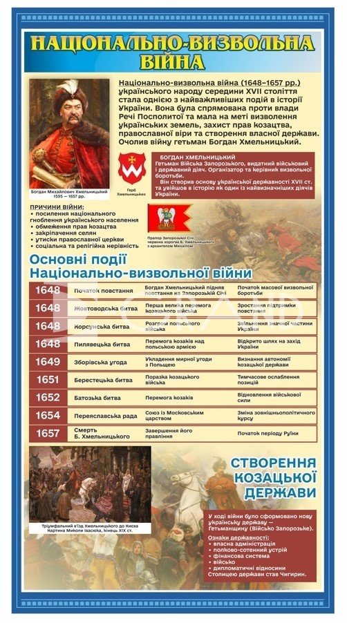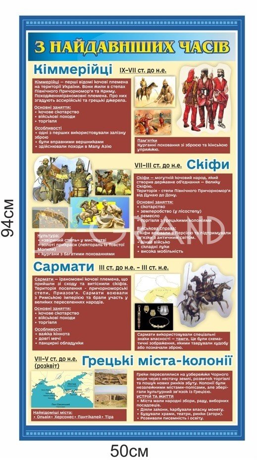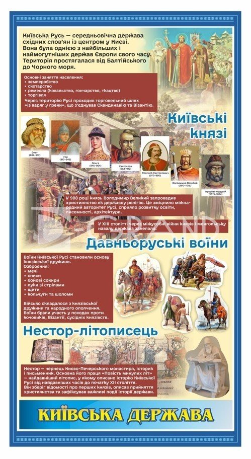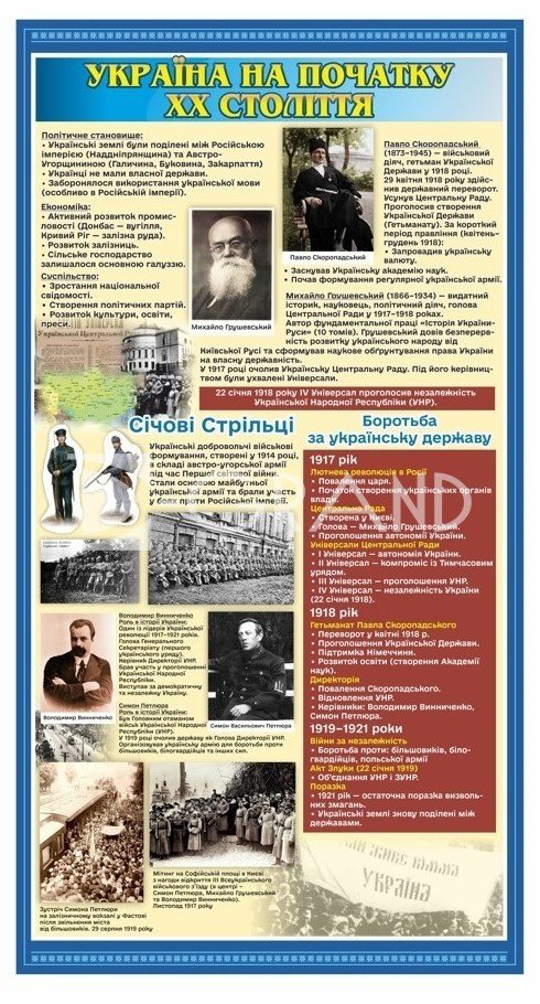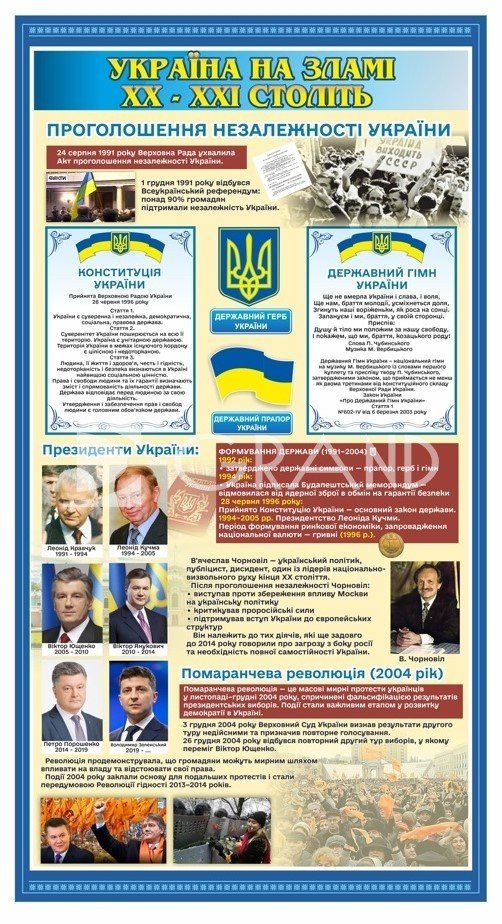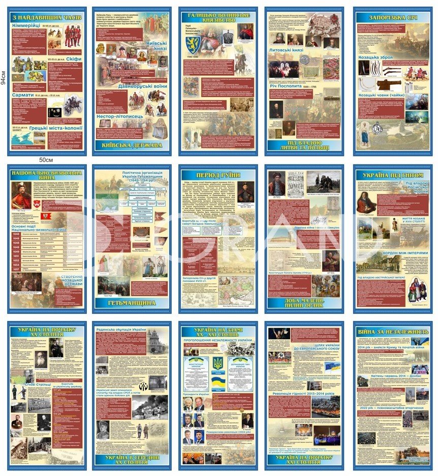 Комплект яскравих інформативних стендів для оформлення кабінету історії в школі, гімназії, ліцеї чи університеті. Набір охоплює всю хронологію української історії — від найдавніших часів до сьогодення.