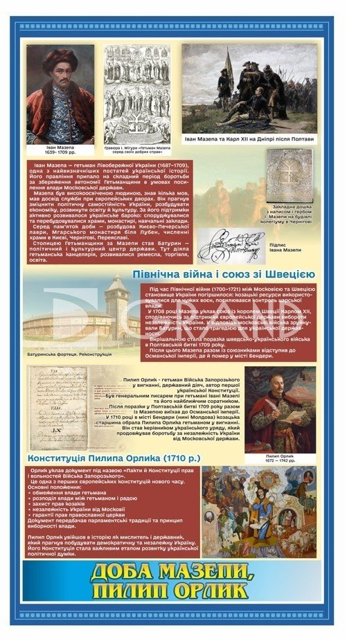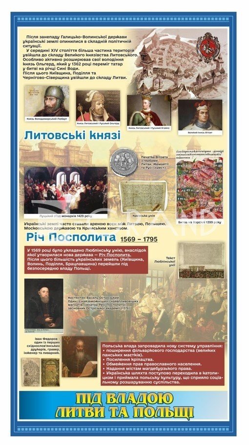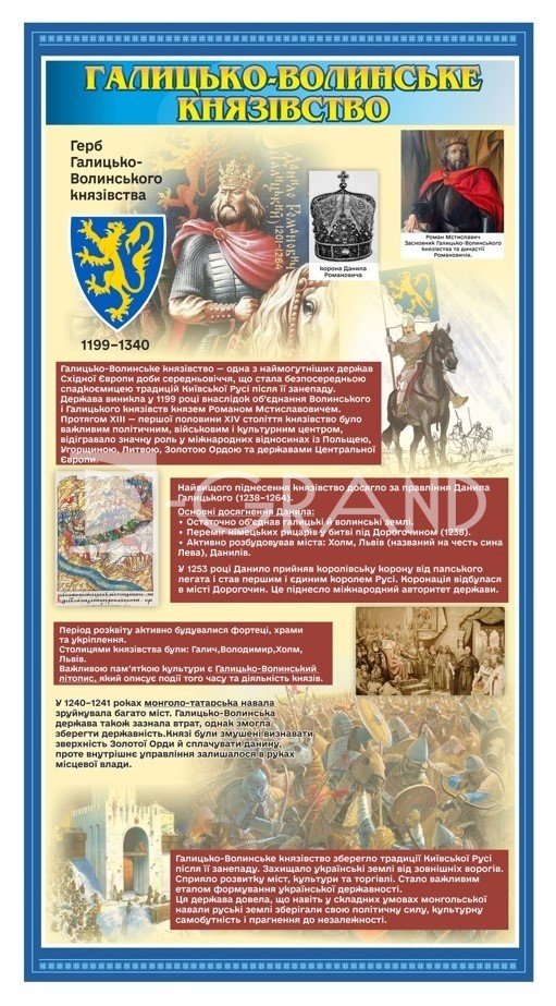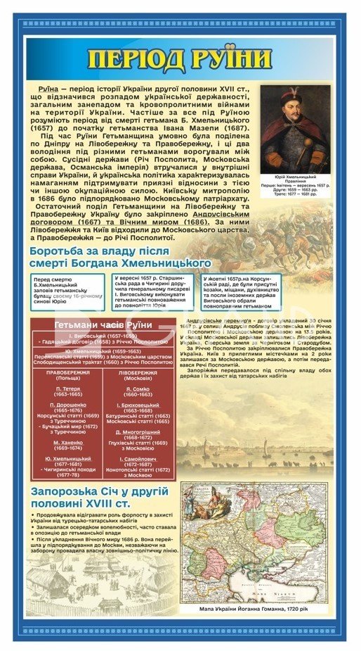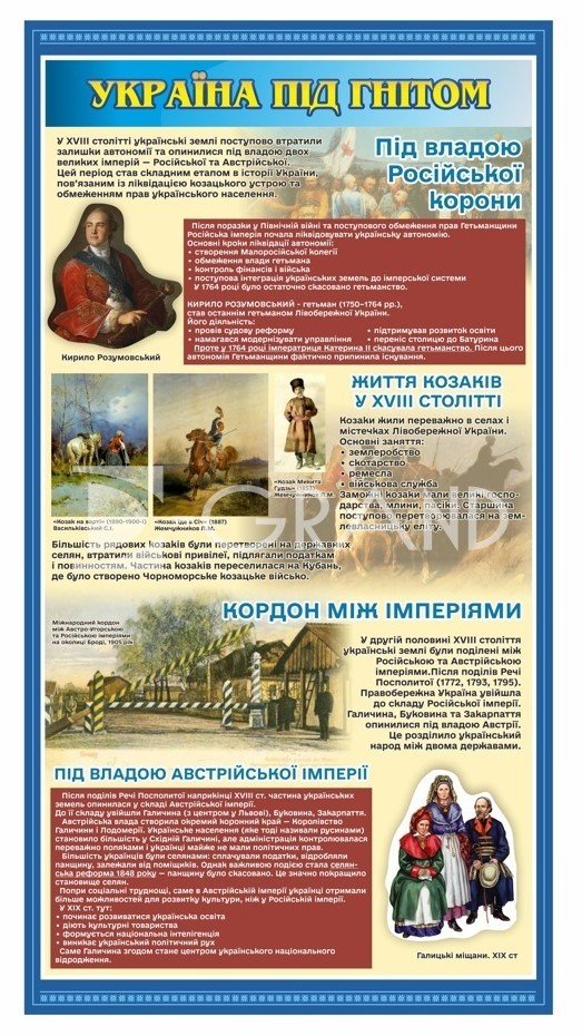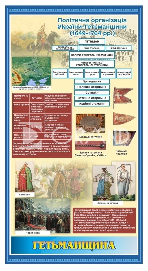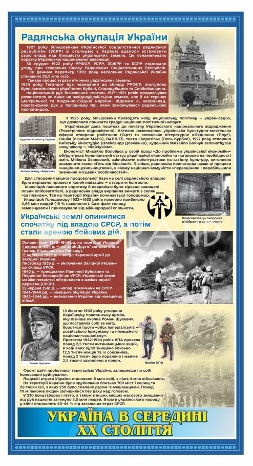 Комплект яскравих інформативних стендів для оформлення кабінету історії в школі, гімназії, ліцеї чи університеті. Набір охоплює всю хронологію української історії — від найдавніших часів до сьогодення.