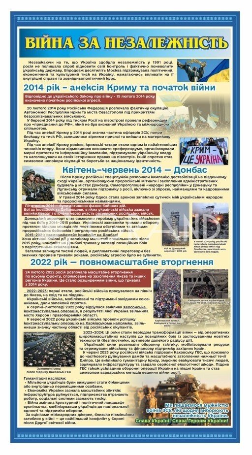 Ідеальне рішення для створення патріотичного та інформативного освітнього простору. Стенди допомагають формувати національну свідомість і глибше розуміти історичний шлях України.