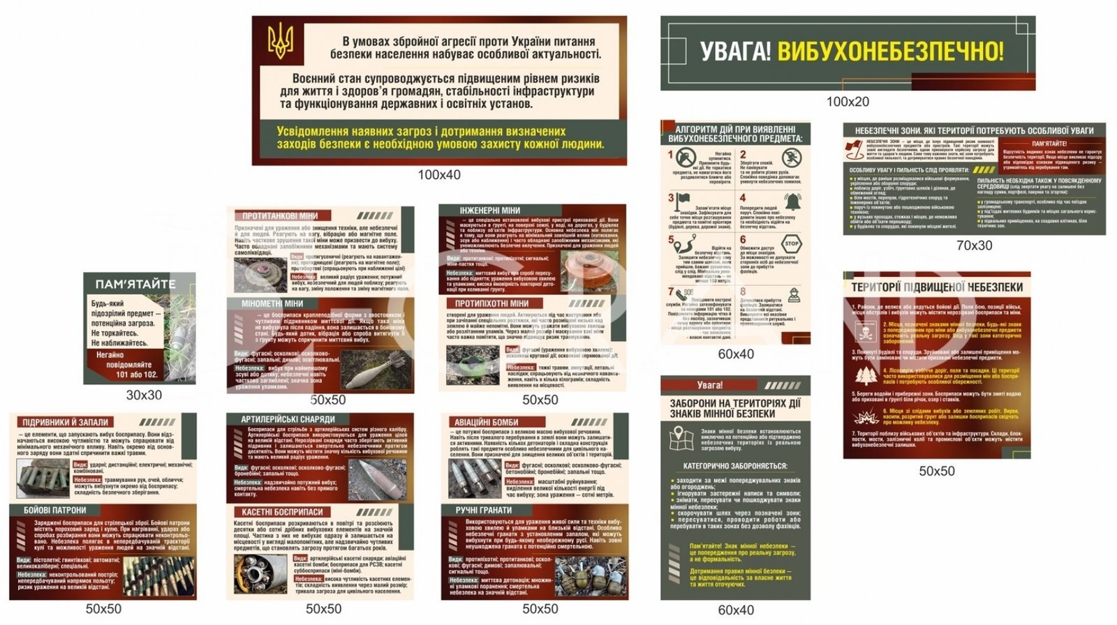 Комплект стендів містить структуровану інформацію про основні види мін, боєприпасів та інших вибухонебезпечних предметів, які можуть становити загрозу для життя. Особлива увага приділена алгоритмам дій при їх виявленні, правилам безпечної поведінки та заборонам, які необхідно чітко дотримуватись.