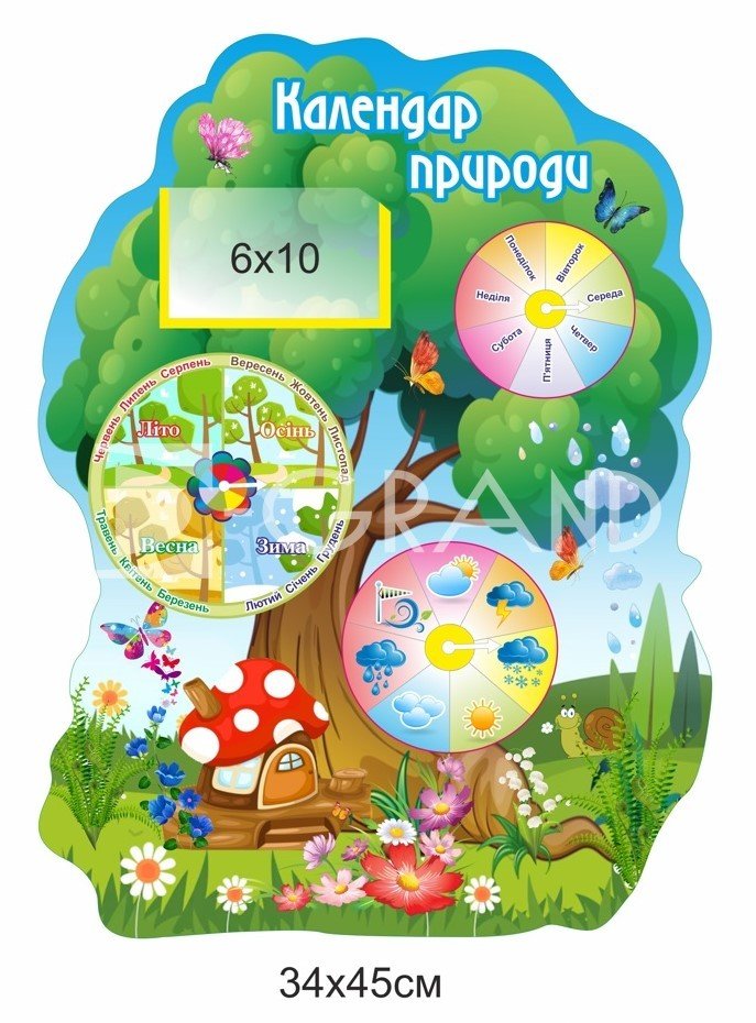 Дитячий стенд «Календар природи» — це яскравий та пізнавальний навчальний посібник для щоденного спостереження за природними явищами. Стенд розроблений спеціально для дитячих садків, початкових класів, НУШ, груп продовженого дня та навчально-розвивальних центрів.