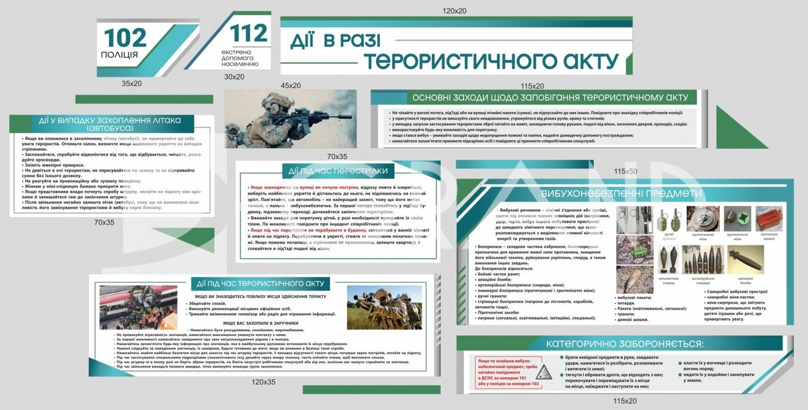 Інформаційний стенд «Дії в разі терористичного акту» призначений для інформування населення про правила поведінки та алгоритми дій у разі виникнення терористичної загрози. Стенд є важливим елементом облаштування класів безпеки, осередків цивільного захисту, навчальних закладів, адміністративних будівель, медичних установ та місць масового перебування людей.