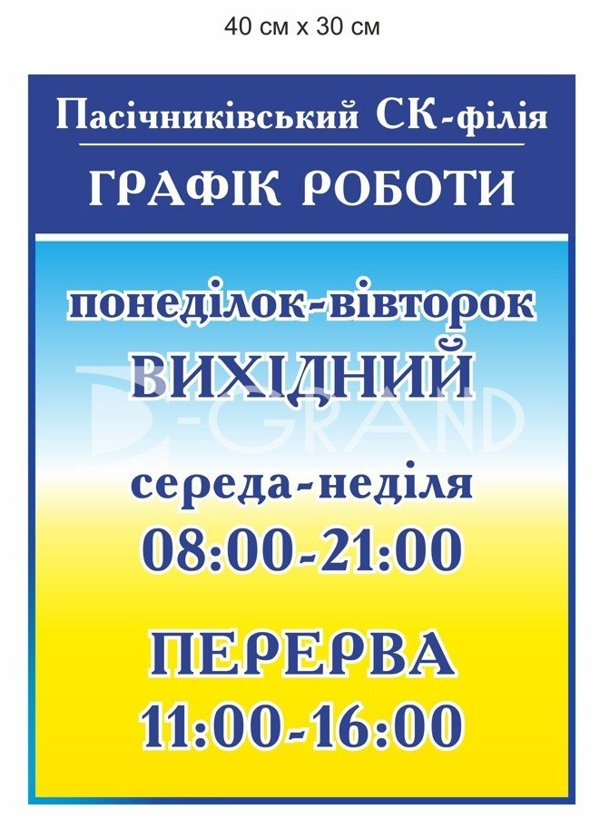 Чітке інформування відвідувачів про режим роботи установи є необхідною умовою для забезпечення якісного обслуговування. Фасадна табличка "ГРАФІК РОБОТИ" від D-GRAND забезпечує максимальну помітність та ясність інформації.