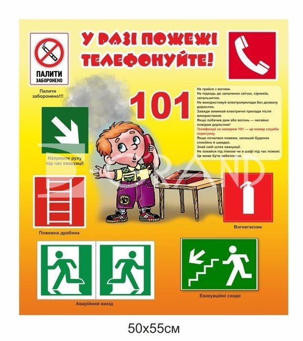 Стенд «У разі пожежі телефонуйте 101» — алгоритм дій під час пожежі, евакуаційні знаки, пожежне обладнання.