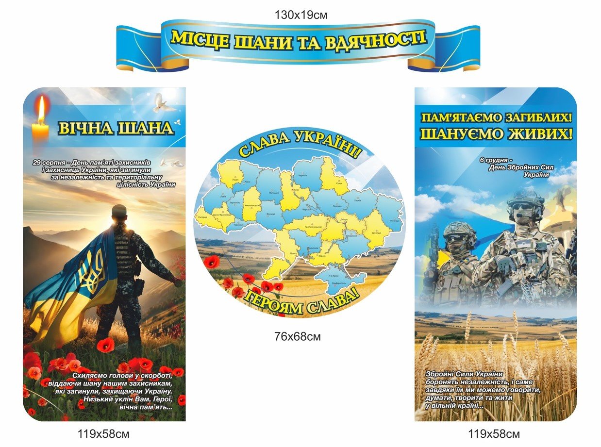 Серед найпопулярніших варіантів оформлення — стенд «Місце шани та вдячності», який може стати центральним елементом патріотичного куточка у школі. У ньому гармонійно поєднуються державна символіка, український прапор, карта України, маки як символ пам’яті, а також теплі слова подяки воїнам. Не менш зворушливими є стенди «Вічна шана» та «Пам’ятаємо загиблих — шануємо живих», що передають глибоку повагу тим, хто боронив і боронить нашу землю. У композиціях часто використано зображення українських захисників на фоні мирного неба, пшеничних ланів, гір і сонця — усе це символізує незламність духу українського народу.