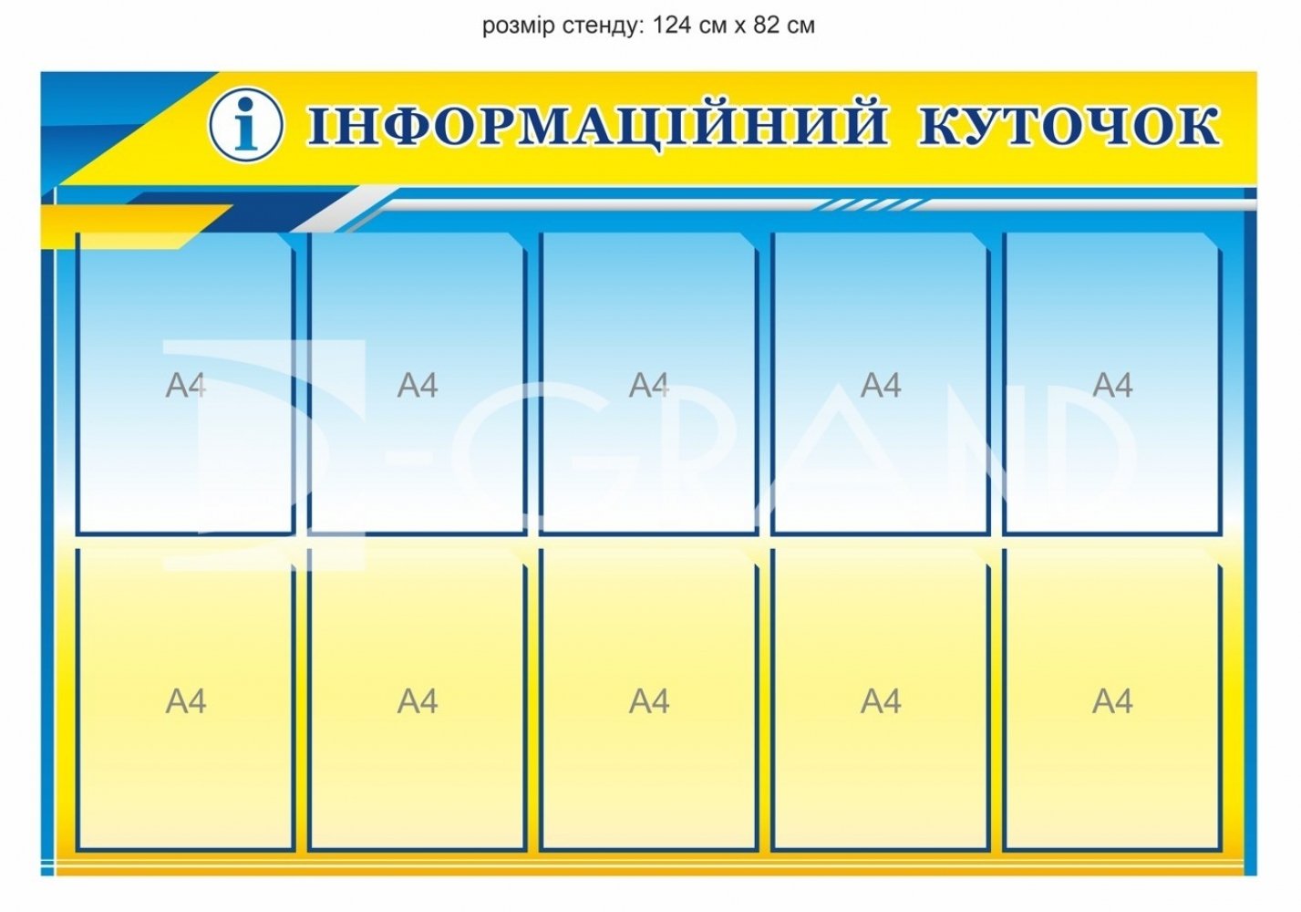 Стенд виконаний у державних кольорах України, що підкреслює офіційний статус установи та відповідає вимогам ділового оформлення. 10 прозорих кишень формату А4 дозволяють зручно розмістити накази керівництва, правила внутрішнього розпорядку, інформацію з охорони праці, пожежної безпеки, оголошення, графіки роботи та інші нормативні матеріали.