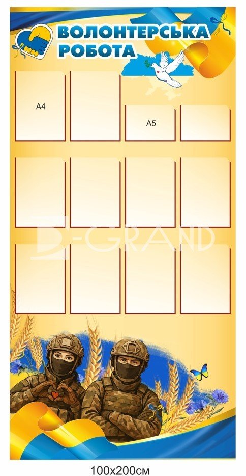 Інформаційний стенд "Волонтерська робота" — це яскравий, змістовний і надихаючий візуальний елемент, що підкреслює вагомість добровільної допомоги в умовах війни.