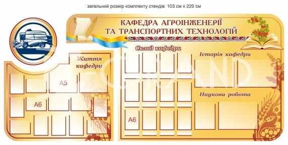 Успіх будь-якої кафедри вищого навчального закладу значною мірою залежить від ефективної комунікації, як внутрішньої, так і зовнішньої. Комплексна композиція стендів "Кафедра Агроінженерії та Транспортних Технологій" від D-GRAND – це ідеальне рішення для презентації вашого підрозділу, його досягнень, історії та актуальних подій. Цей набір стендів стане центральним інформаційним пунктом у вашій кафедрі.