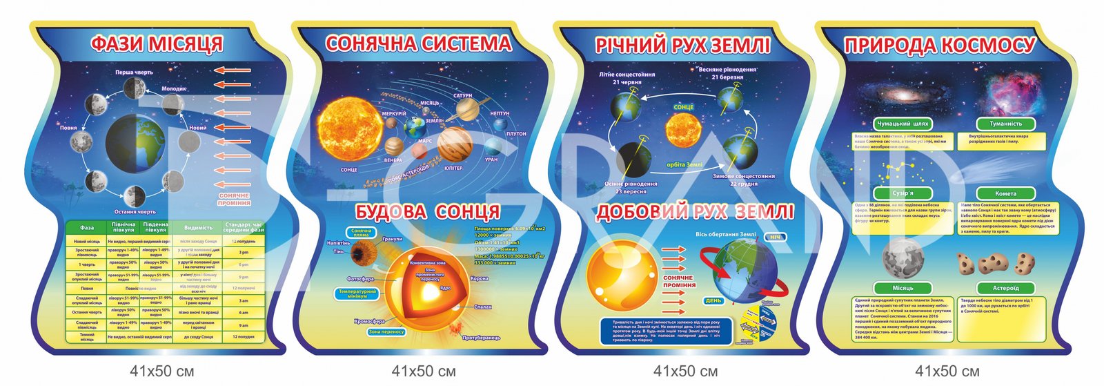 Комплект астрономічних стендів "Фази місяця" "Сонячна система" "Річний рух землі" "Природа космосу"