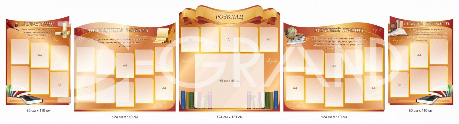 - Стенди покриваються плівкою з повнокольоровим друком.