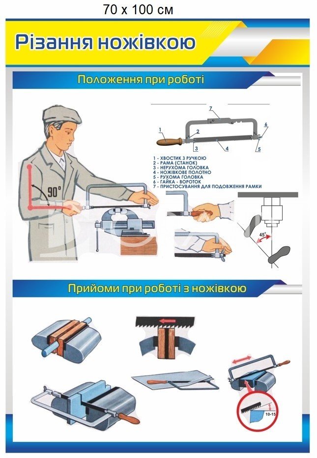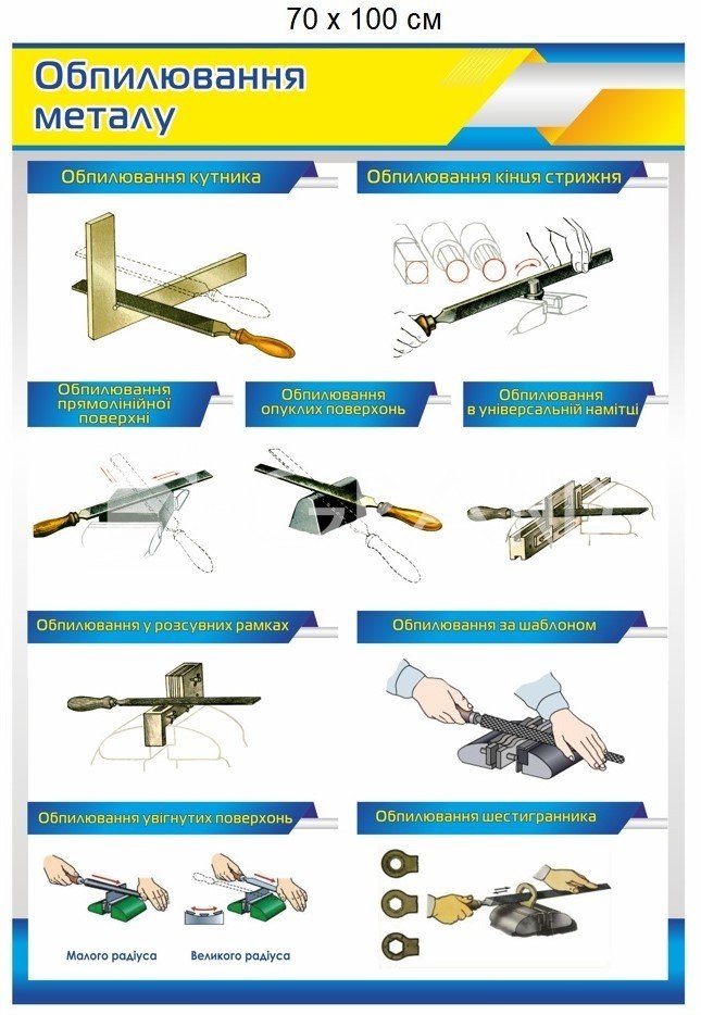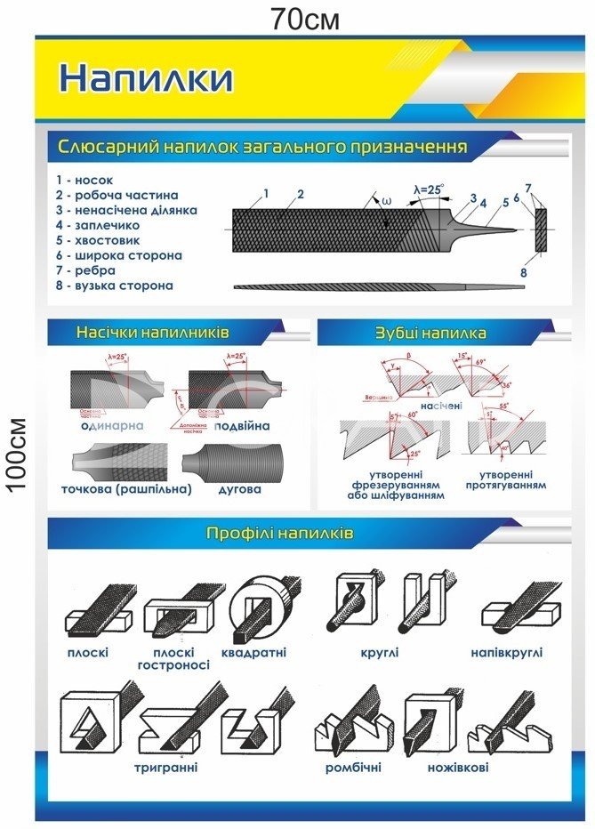 У комплект входять плакати з темами: напилки, обпилювання металу, свердління, рубання, клепання, різьба та інші операції. Ілюстрації виконані у зрозумілій формі, що робить навчальний процес більш ефективним і цікавим.