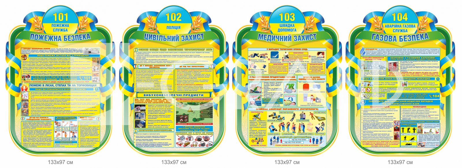 У комплекті містяться стенди про пожежну безпеку, безпеку на дорозі, безпеку в природному середовищі, безпеку вдома, безпеку в електромережі, технічну безпеку та інші. Кожен стенд містить ілюстрації, правила та рекомендації, які допомагають усвідомити правила безпеки та діяти відповідно до них.