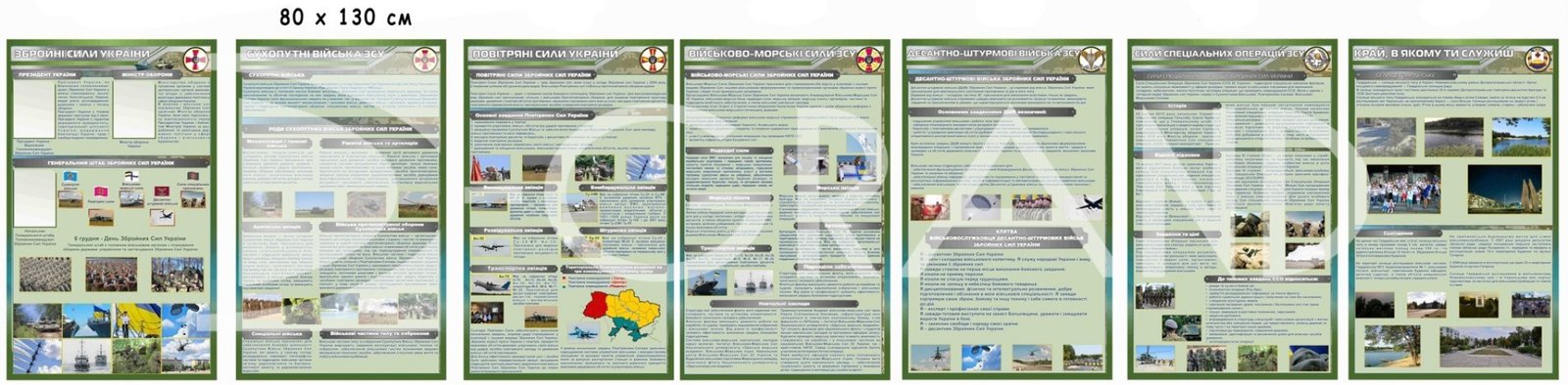 Комплект стендів для військової частини, присвячений Збройним силам України, включає інформацію про різні роди військ, їхнє призначення, структуру, а також символіку і традиції. Такий комплект стендів стане потужним джерелом інформації для військовослужбовців і підкреслить важливість кожного компоненту Збройних Сил України.