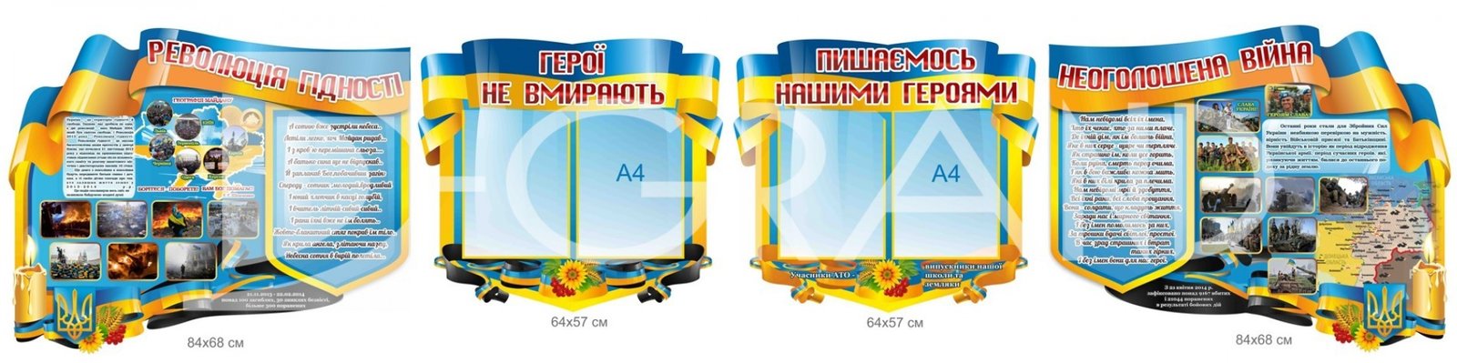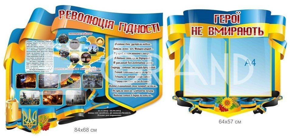 Цей комплект стендів створений для вшанування пам'яті та подвигів героїв, які захищали і продовжують захищати Україну під час Революції Гідності, а також у ході сучасної неоголошеної війни. Стенди слугують нагадуванням про жертовність, мужність і патріотизм українців, що боролися за свободу і незалежність нашої держави. Комплект сприяє вихованню патріотизму серед молоді та глибшому розумінню новітньої історії України.