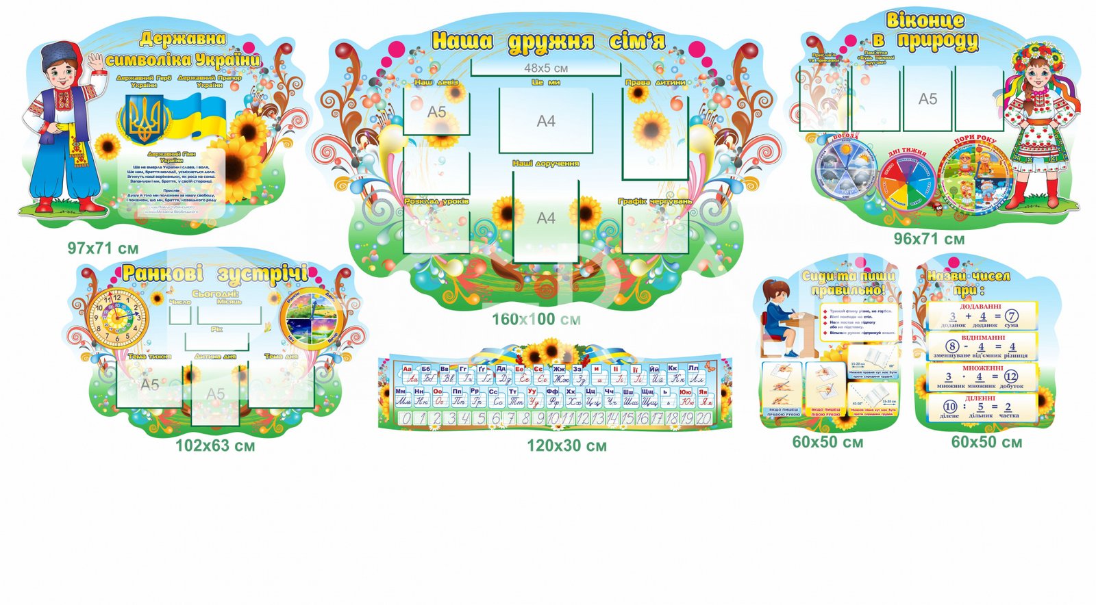 Комплект стендів "Ранкові зустрічі" "Наша дружня сім'я" "Віконце в природу" для початкової школи