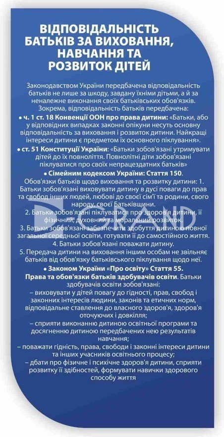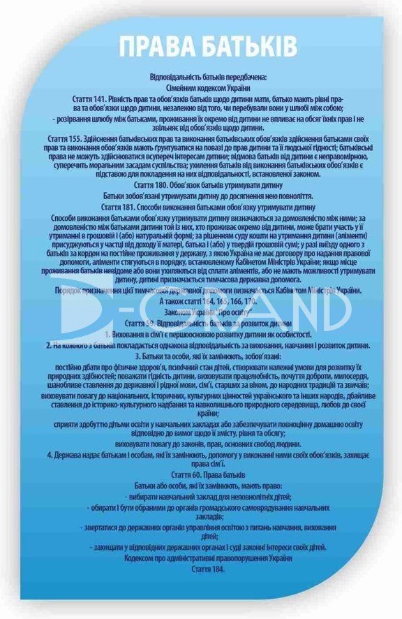 Стенд підкреслює важливу роль батьків у навчальному процесі, містить інформаційні блоки щодо прав та обов’язків, основних правил виховання, відповідальності батьків, а також передбачає зручні кишені формату А5 для розміщення актуальних пам’яток, оголошень і рекомендацій.