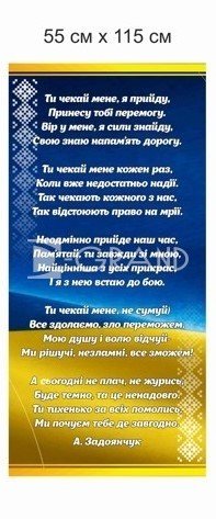 Центральна панель прикрашена образом українського янгола у вишиванці, який символізує захист і духовну міць нашого народу. Композиція виконана з композитних панелей, стійких до погодних умов, із прозорими акриловими кишенями для зручного розміщення інформаційних матеріалів, фото чи документів.
