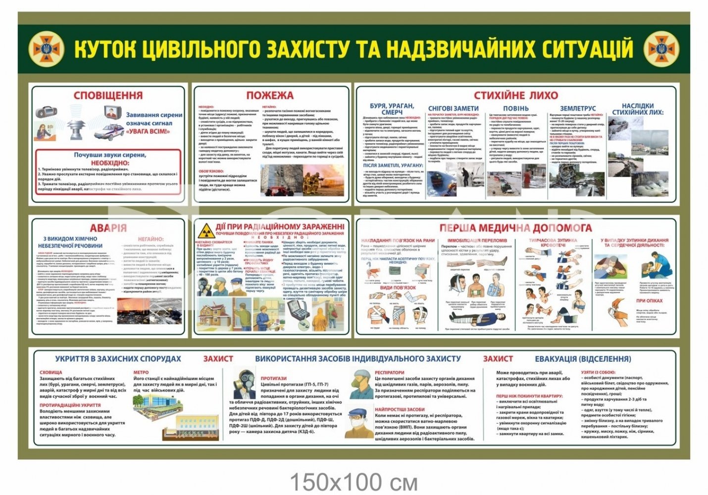 Куточок цивільного захисту та надзвичайних ситуацій від D-Grand - це незамінний інструмент для забезпечення безпеки вашого колективу в небезпечних ситуаціях. Цей стендвключає інформативні стенди з ключовими вказівками щодо аварій, першої допомоги та правил поведінки під час радіаційного лиха.