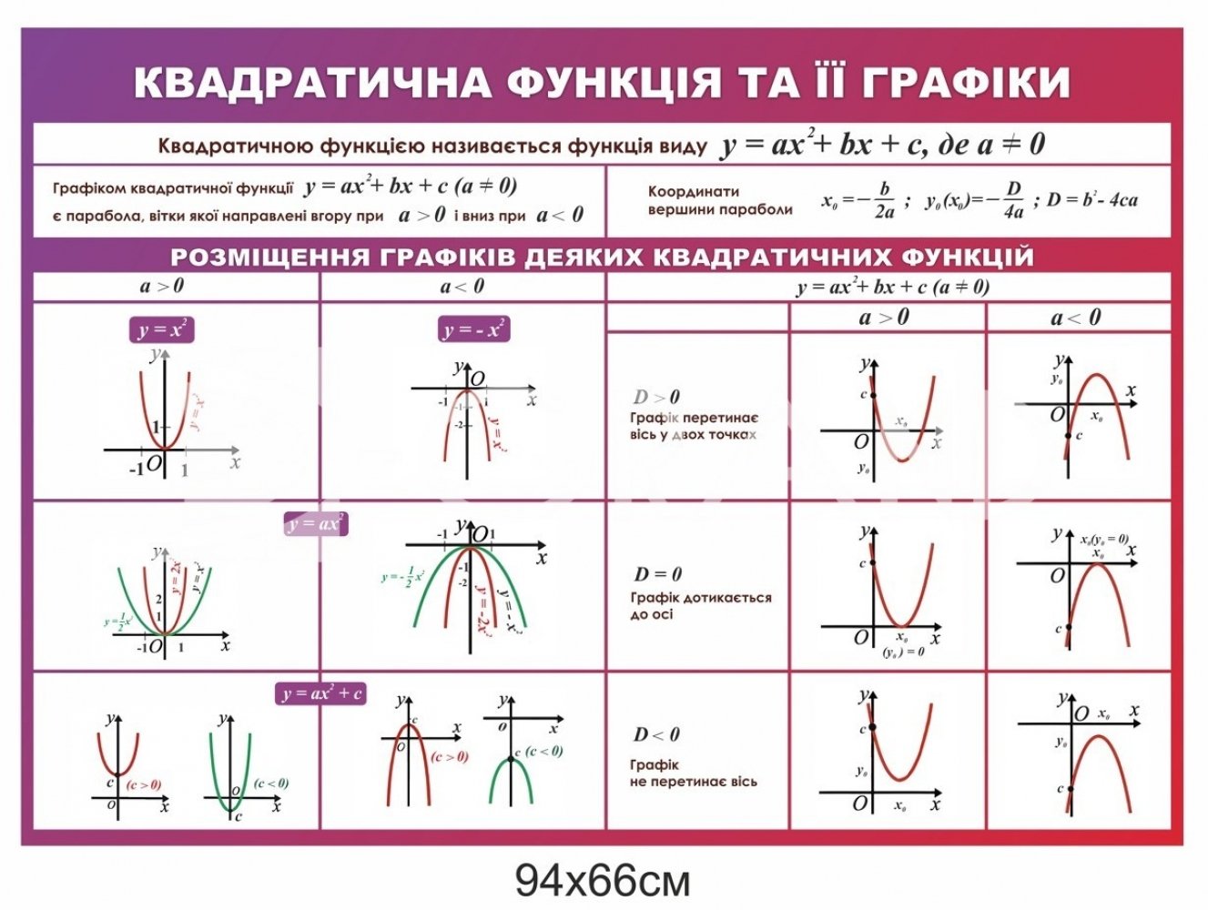 Стенд «Квадратична функція та її графіки» — це сучасний та наочний навчальний матеріал, створений для оформлення кабінету математики у школах, гімназіях, ліцеях та освітніх центрах. На стенді подано основні властивості квадратної функції, форму параболи, вплив коефіцієнтів a, b, c на вигляд графіка, а також приклади побудови графіків.